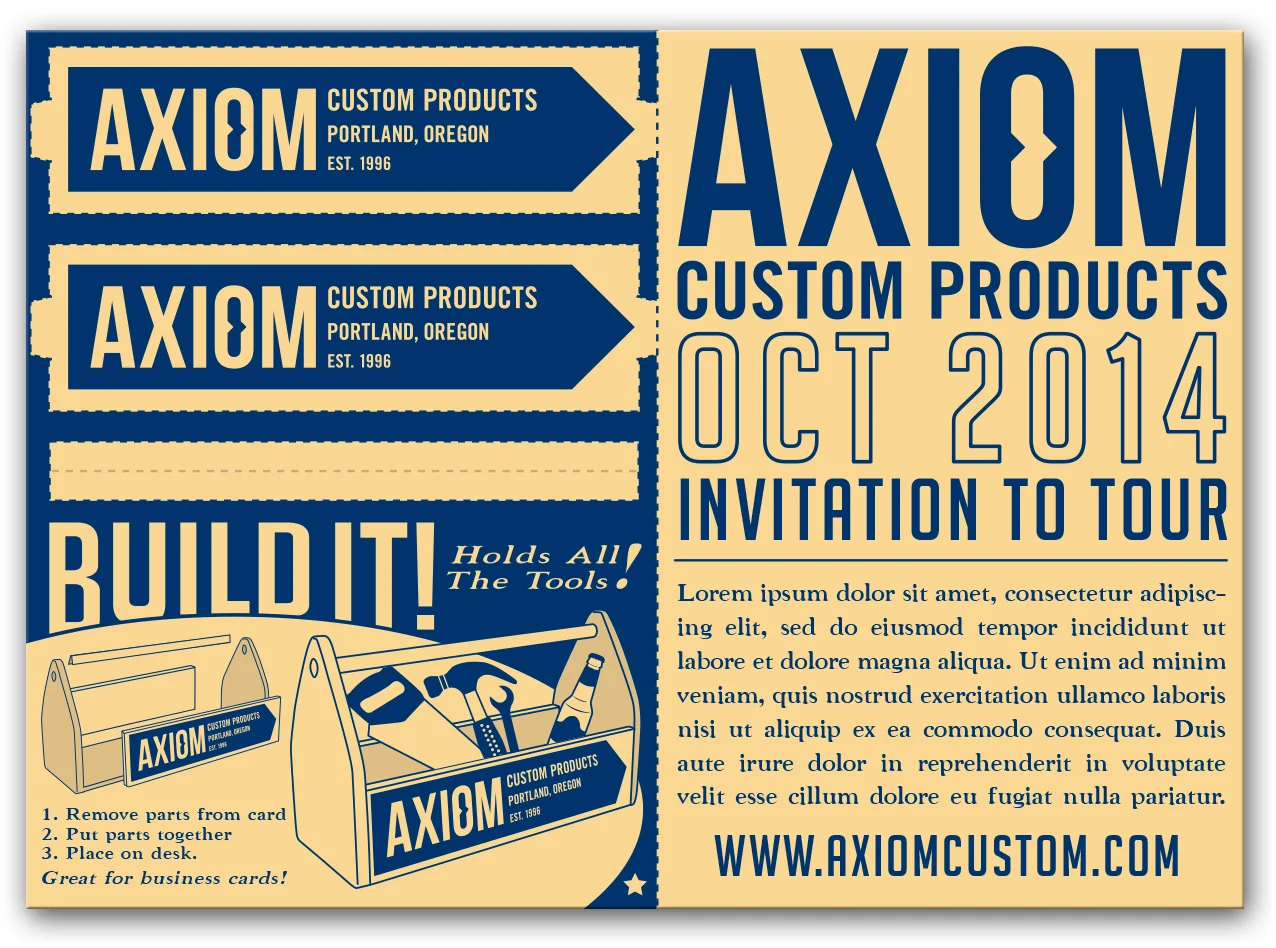 I created the illustrations and designed this post-card/invitation for Axiom Custom Products. In final production, it is printed on balsa wood and is accompanied by a thin sheet of aluminum with punch out tools and additional parts for the tool box.